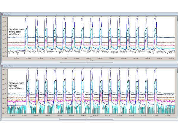 A real life example where degas monitoring of a signature mass could only be achieved when utilizing V-lens technology is shown in the figure. The baseline is significantly reduced allowing for unequivocal identification of the target mass. This allows for faster and easier identification of trace gases which is critical in many manufacturing processes.