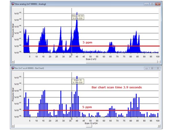 The patented wide dynamic range detector electronics allow detection of single figure parts per million chamber leaks or contaminants, even when simultaneously measuring major gas peaks in the e-3 mbar range. This is possible in a single scan or peak jump data acquisition with less than 20 ms between the maximum and minimum signal levels and without the need for an expensive electron multiplier which needs frequent calibration and replacement.