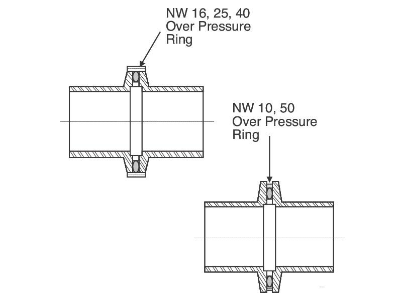 If system pressures are in the positive pressure range, it is recommended that over pressure rings are used. The ISO-KF over pressure rings are installed differently by size. The NW 16, 25, and 40 ISO-KF rings are installed over the two ISO-KF flanges. The NW 10 and 50 ISO-KF rings are installed between the two flange faces. The clamp is installed around all items to secure the assembly.
