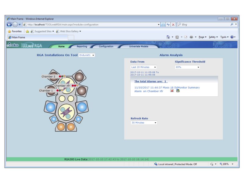 Using the TOOLweb RGA sensor integration option for process tools, the Vision 2000-P XD can be used as a degas chamber sensor in a completely automated process environment (see figure). TOOLweb RGA maintains a constant monitoring of tool activities with all sensor data being framed by wafer logistics before alarm models are applied. Full alarm and data reporting to the FAB host and FDC are available allowing real-time monitoring of chamber conditions and flagging of any process excursions from ideal conditions.