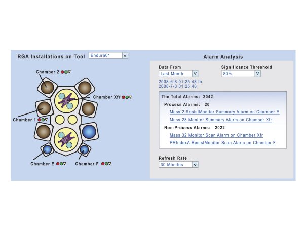 The tool dashboard provides an instant view of the status of the tool, the health of each sensor, and the latest alert status for the chambers. It also provides an automated Pareto analysis of the warnings and alarms from the sensors being monitored on the tool. Instead of running a report for each chamber or process, a web page link makes it possible for engineers to see at a glance any recurring problems and to drill down further into the data. From the tool dashboard it is possible to link to all of the TOOLweb RGA web pages.